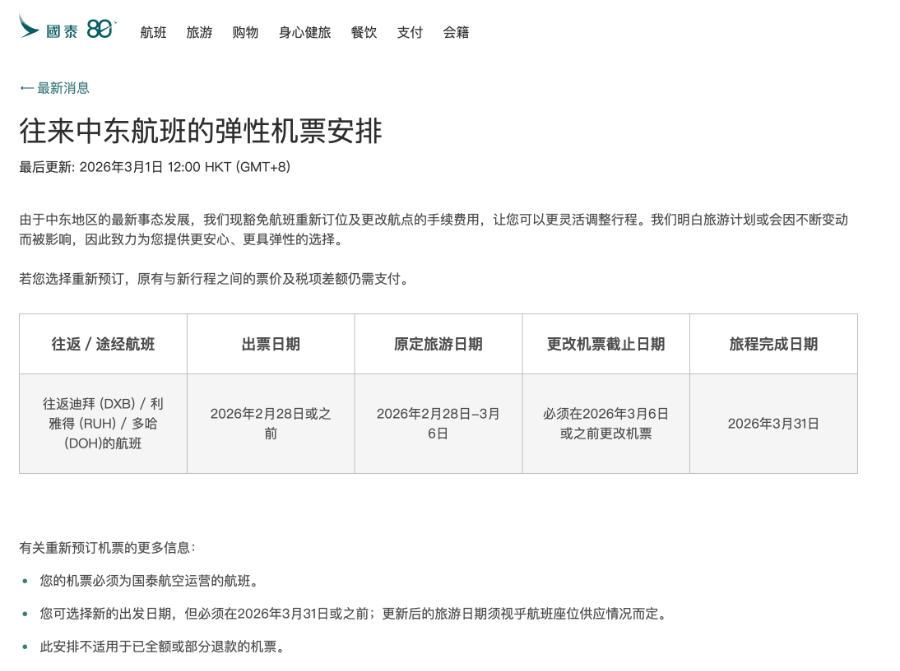 国泰航空官网显示,出票日期在2026年2月28日或之前的所有往返或途径迪拜、利雅得和多哈的航班,均已豁免航班重新订位及更改航点的手续费。