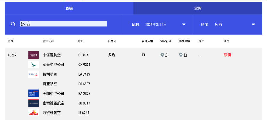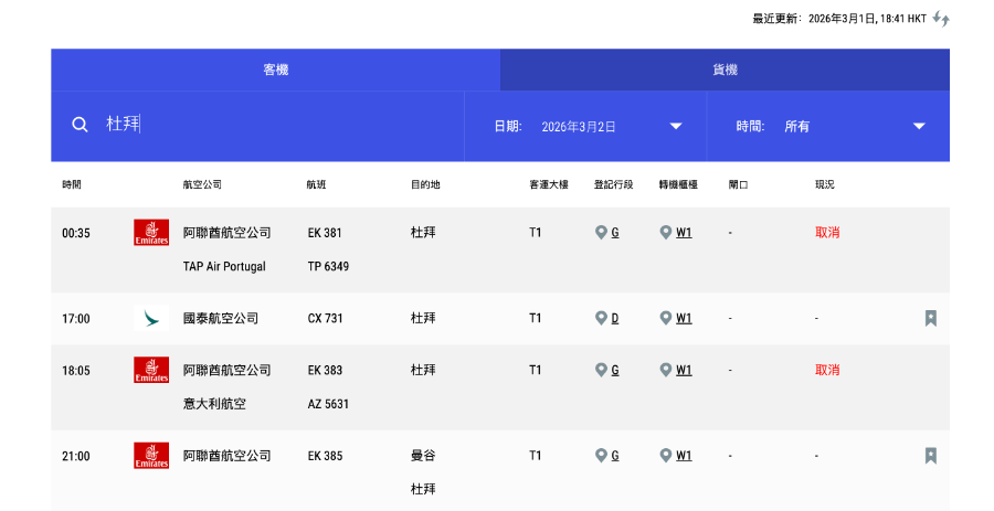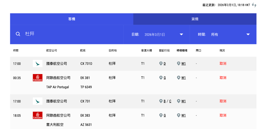 南方财经记者查询香港国际机场官网发现,今日(3月1日)和明日(3月2日)所有飞往利雅得、多哈和迪拜的航班均已显示“取消”状态。